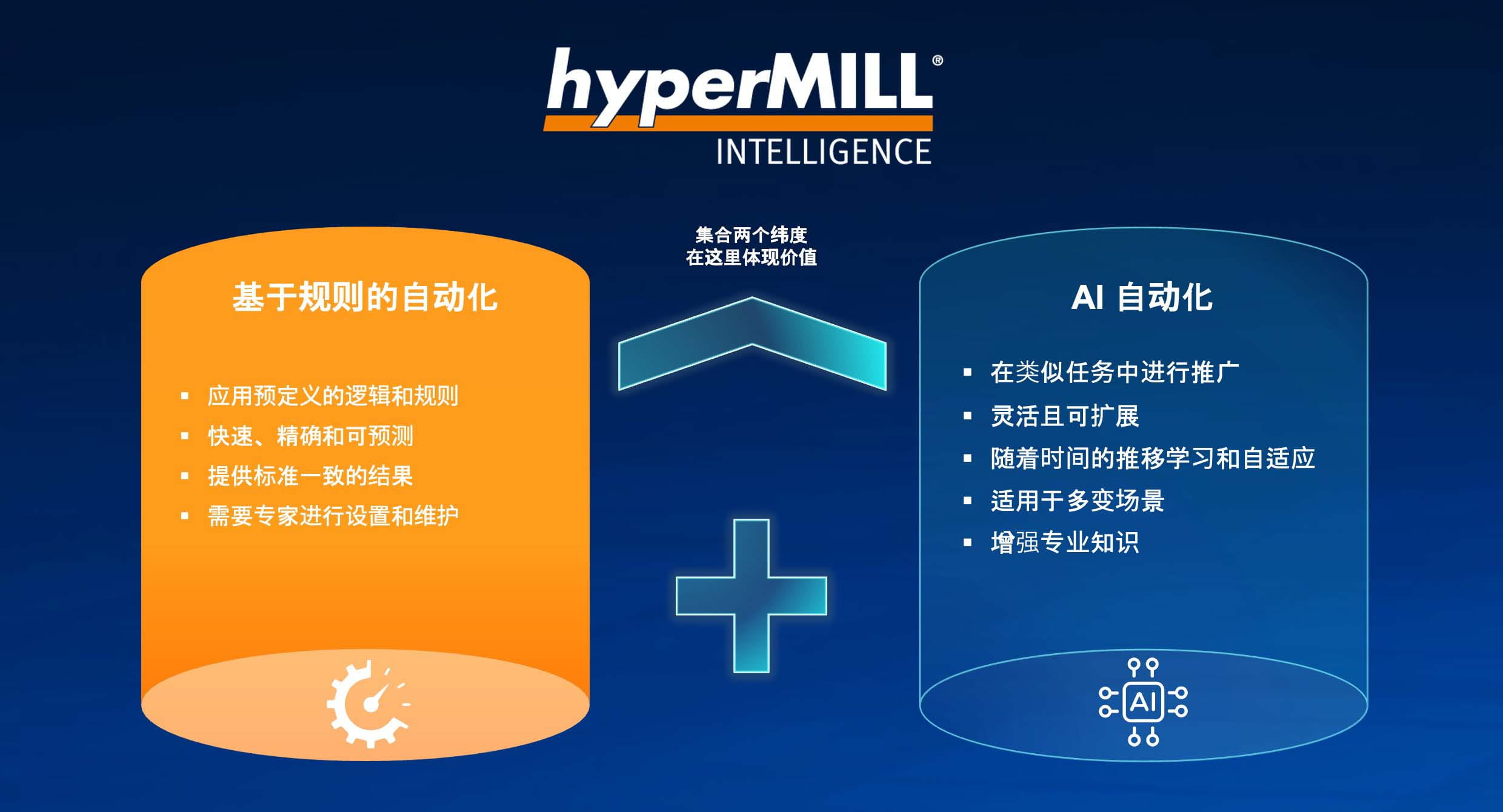 在制造领域,为确保精度与可靠性,往往需要基于规则的自动化,依托经验证的逻辑与企业专有知识实现一致且透明的结果。需要灵活性与模式识别时,AI 能带来价值。hyperMILL INTELLIGENCE结合两种方式的优势:在精度至关重要之处采用规则控制,在确有增益之处引入人工智能支持,以真正优化客户流程。