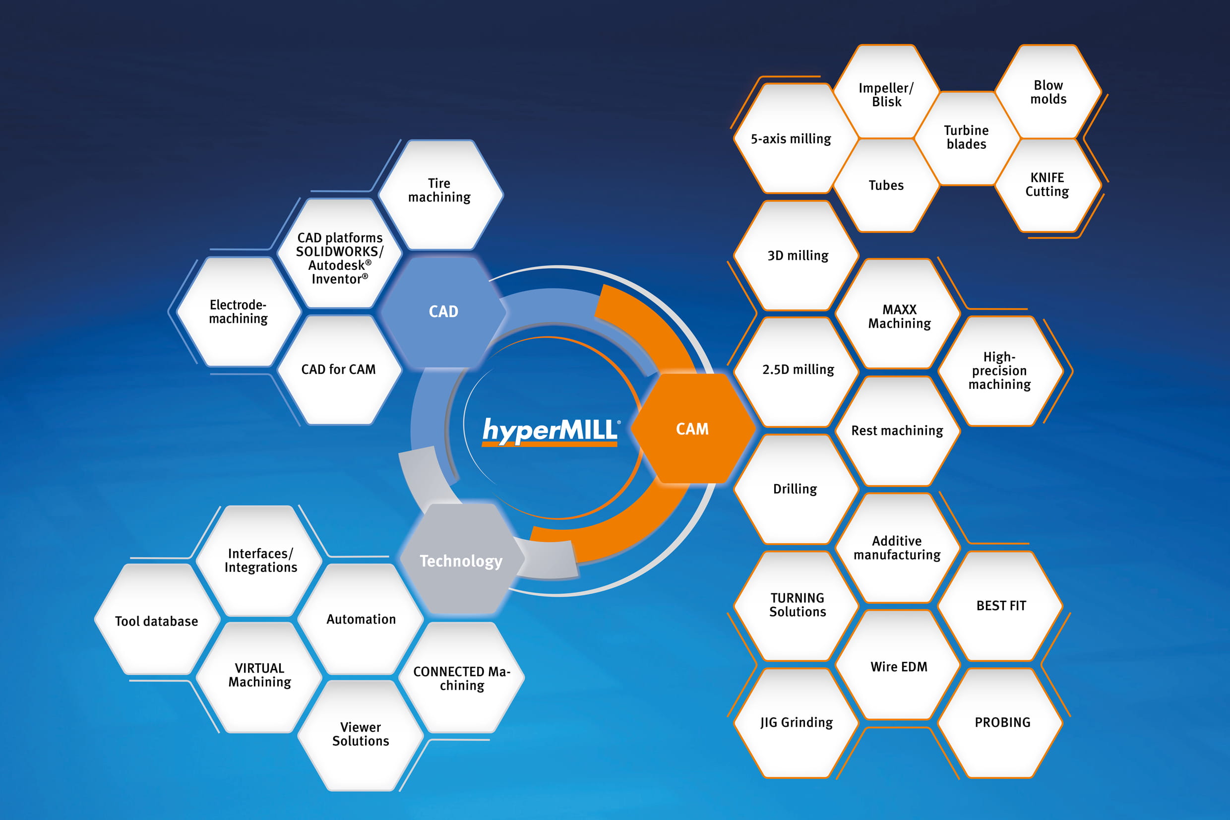 Technologies such as HPC machining for turning and milling, True-Shape Technology for perfect surfaces, and intelligent feed rate adjustment optimize processes in a targeted manner and make them significantly more efficient. The strategy portfolio is complemented by hyperMILL® VIRTUAL Machining for NC code simulation and optimization, as well as powerful automation technology that reduces programming effort and increases productivity.