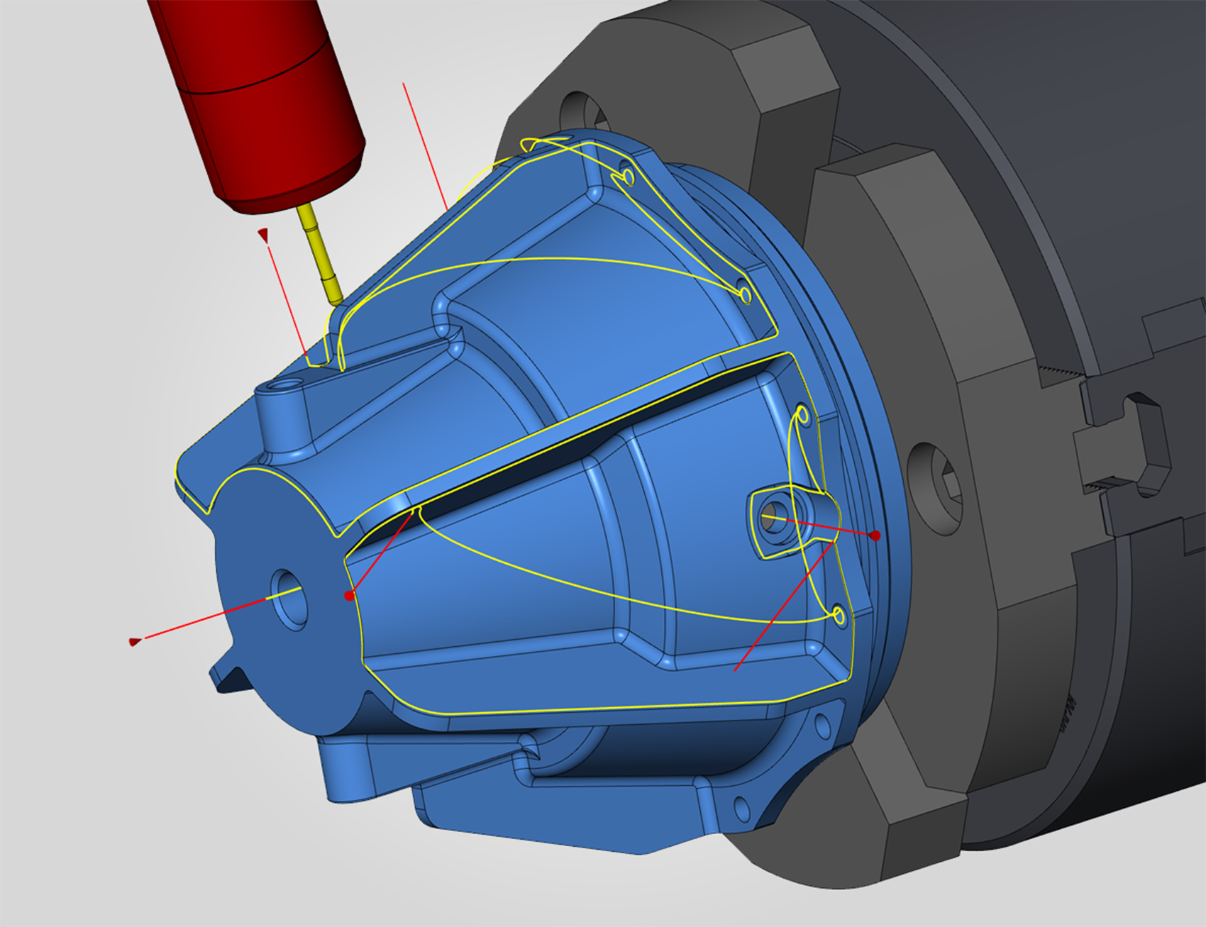 New in hyperMILL® VIRTUAL Machining: Simulation of part transfer on a machine with main and counter spindles and a milling head.