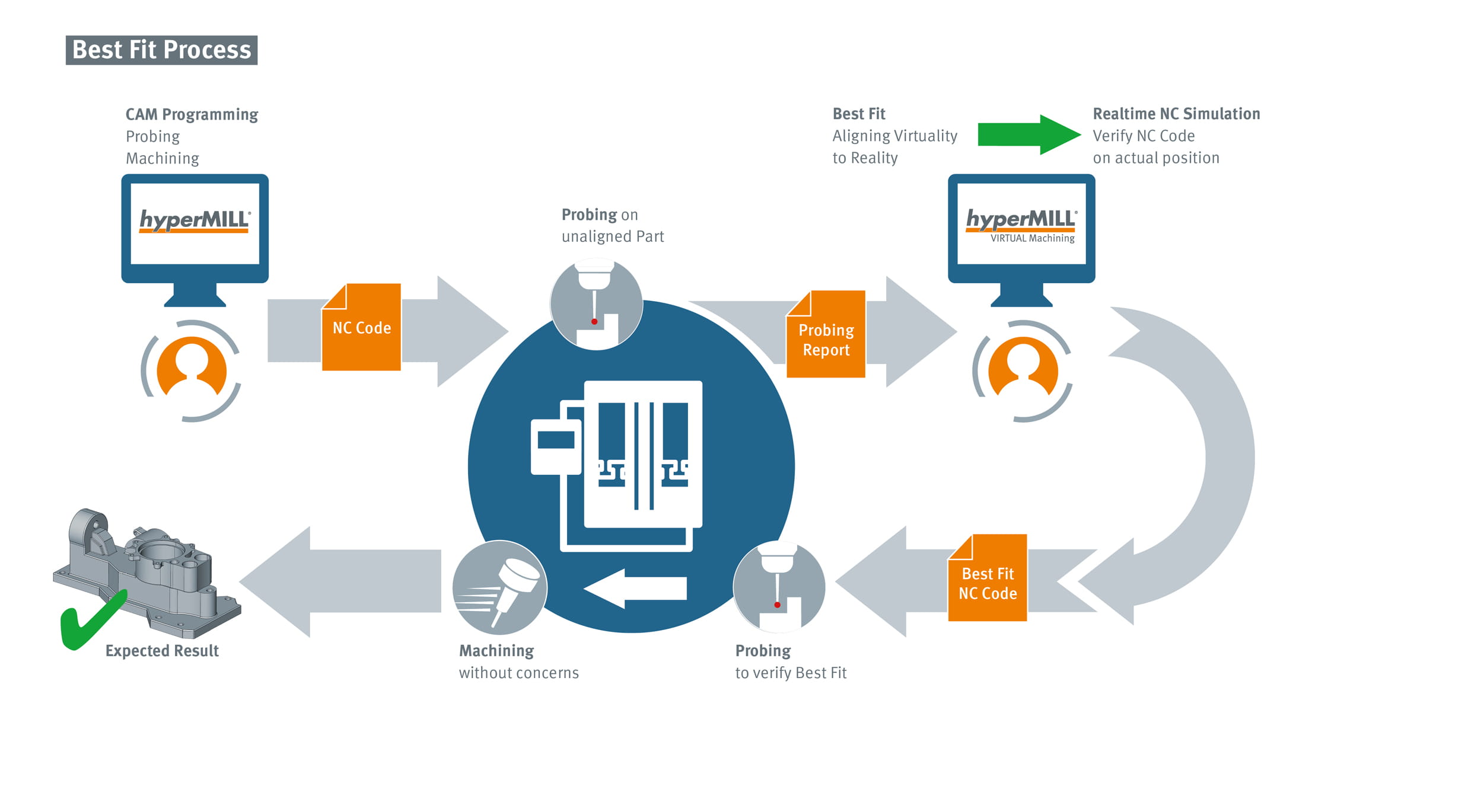 Apart from the special case of hybrid machines, where additive and subtractive manufacturing are performed consecutively, postprocessing requires the setting-up of a raw part with small allowances in the machine tool. In hyperMILL®’s virtual machine, OPEN MIND has introduced BEST FIT, an innovative alternative to manual alignment of workpieces for further machining. The prerequisite is a 5-axis machining center with a digital probe. The misaligned raw part billet is probed directly on the machine, and the measurement protocol is transferred to the CAM system. The software adapts the NC code to the real part position. This way, the virtual programming environment is aligned with the actual clamping situation.