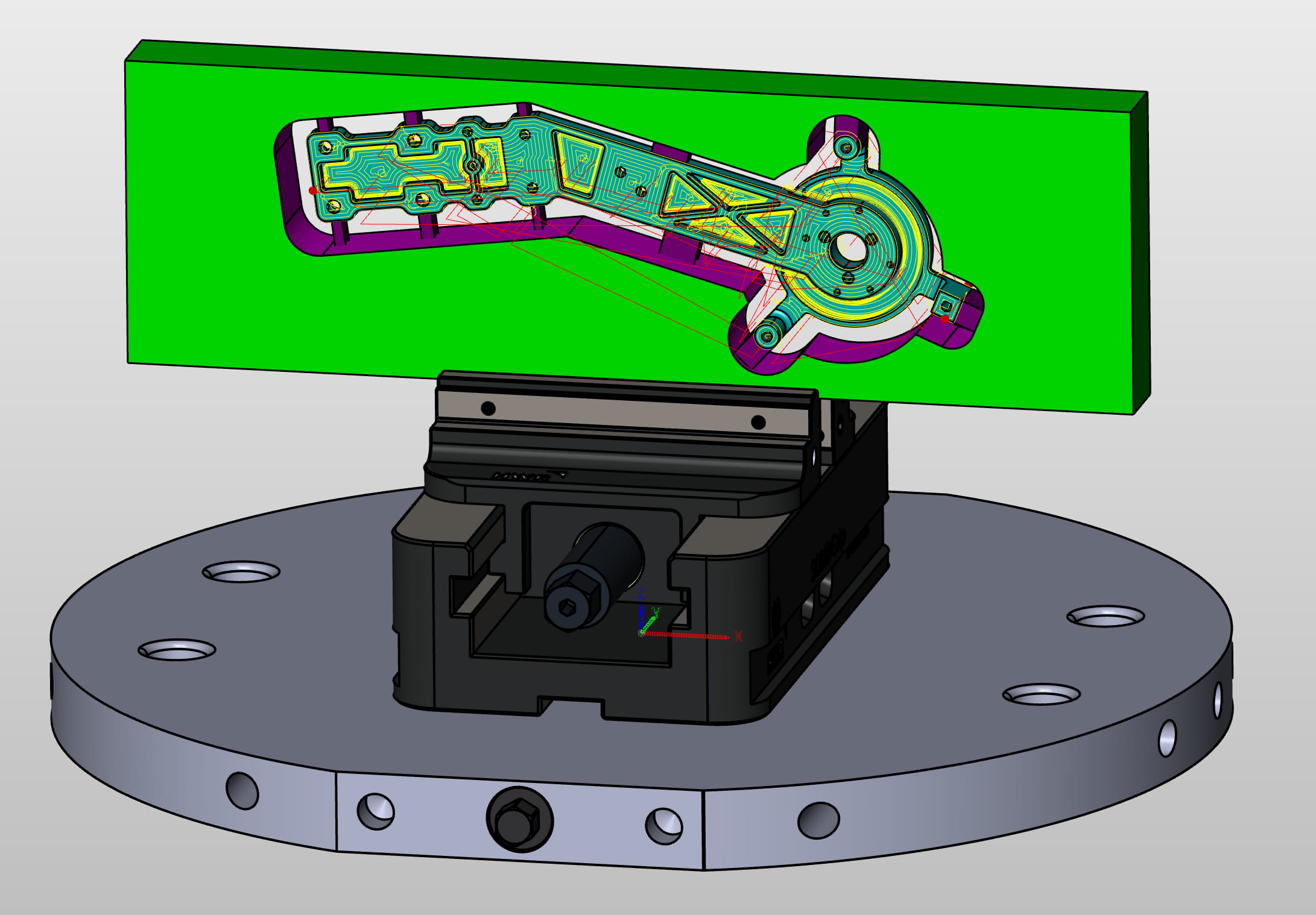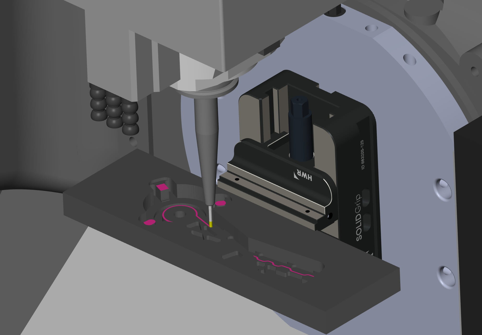 Held in an HWR self-centering 5-Axis Vice located on top of a Zero Point Fixture plate permanently mounted to the Hermle C250 Systems Trunnion.